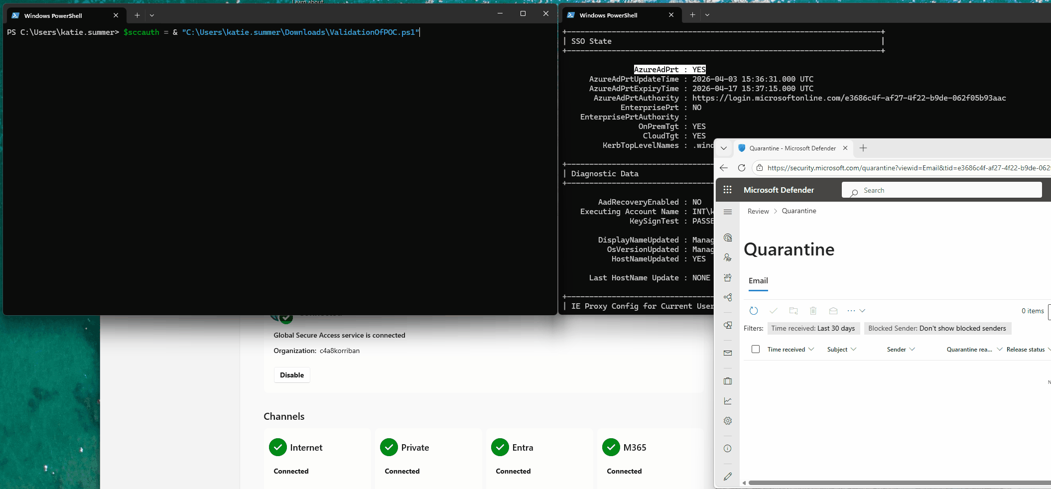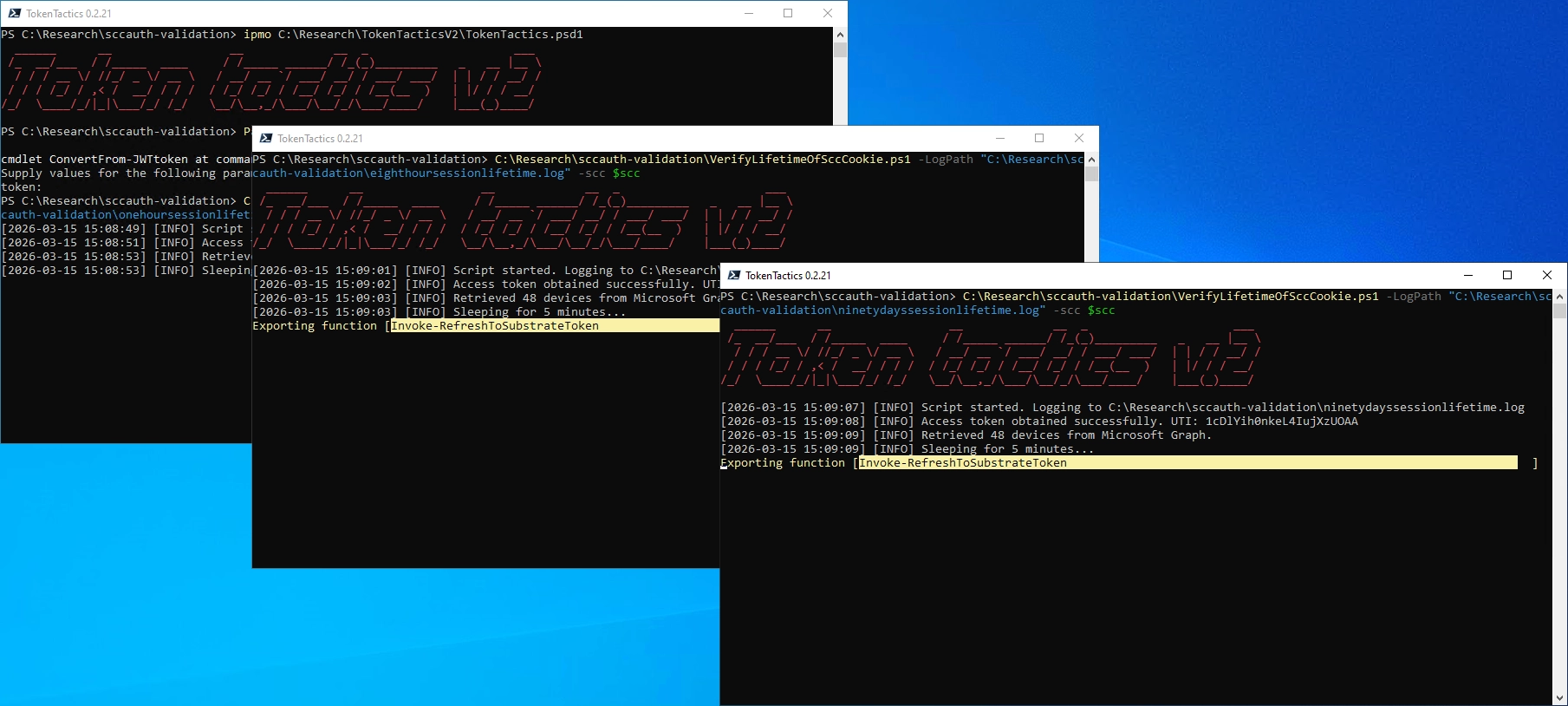 An attacker who has control over the device through an implant can extract the sccauth cookie value from the browser and exfiltrate it to an infrastructure they control. And for the lifetime of the cookie value they now can request fresh access tokens from various services. In the non-interactive signin logs those requests will be recorded, but neither the change in IP address, nor the change in device is reflected in any way. This makes it very hard to detect.