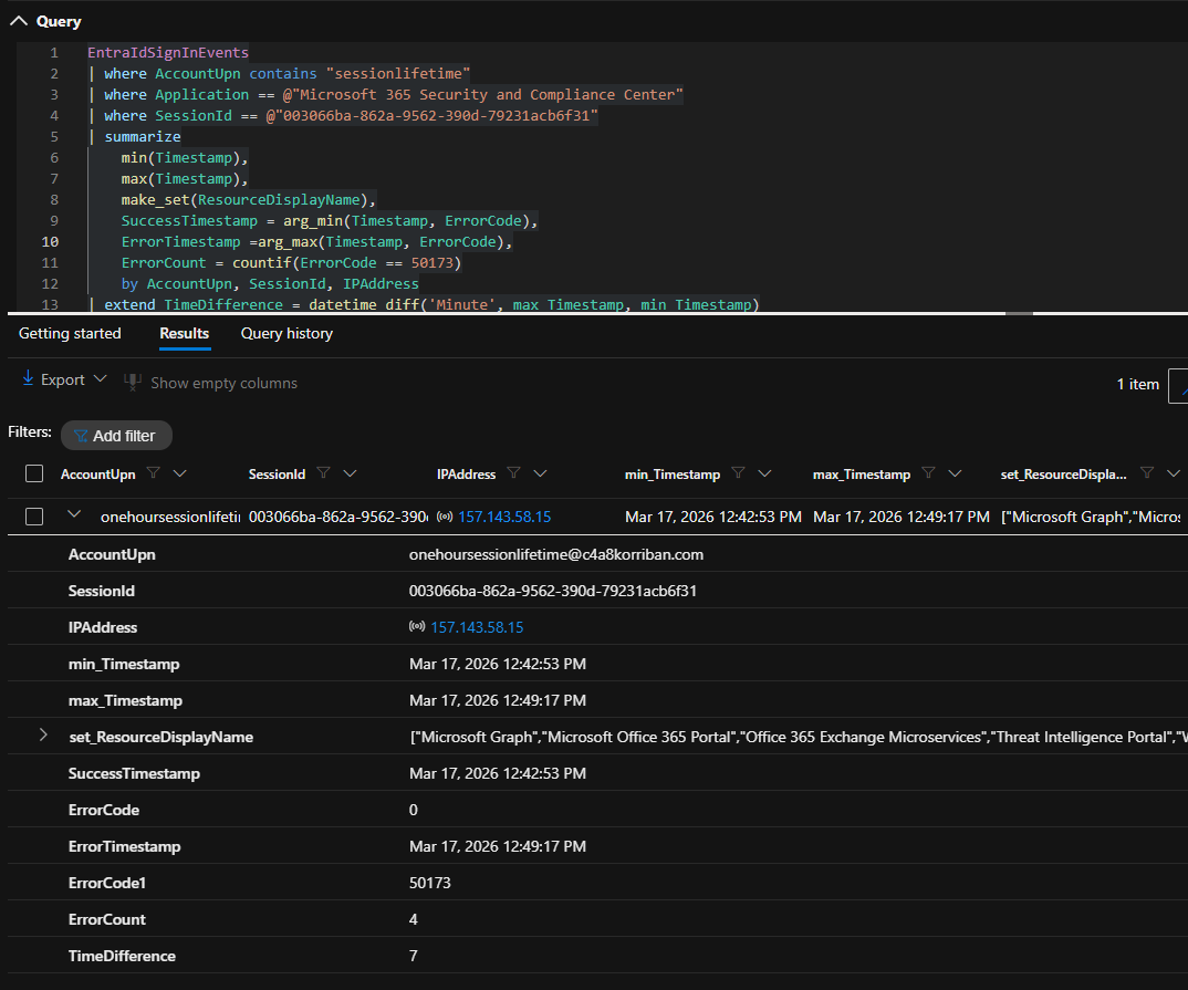 In a second test I revoked the user’s sessions in Entra ID and access was blocked at the next token refresh, showing again that the revocation of sessions in incident response is more than a nice to have. The error code of the event was 50173 and read: